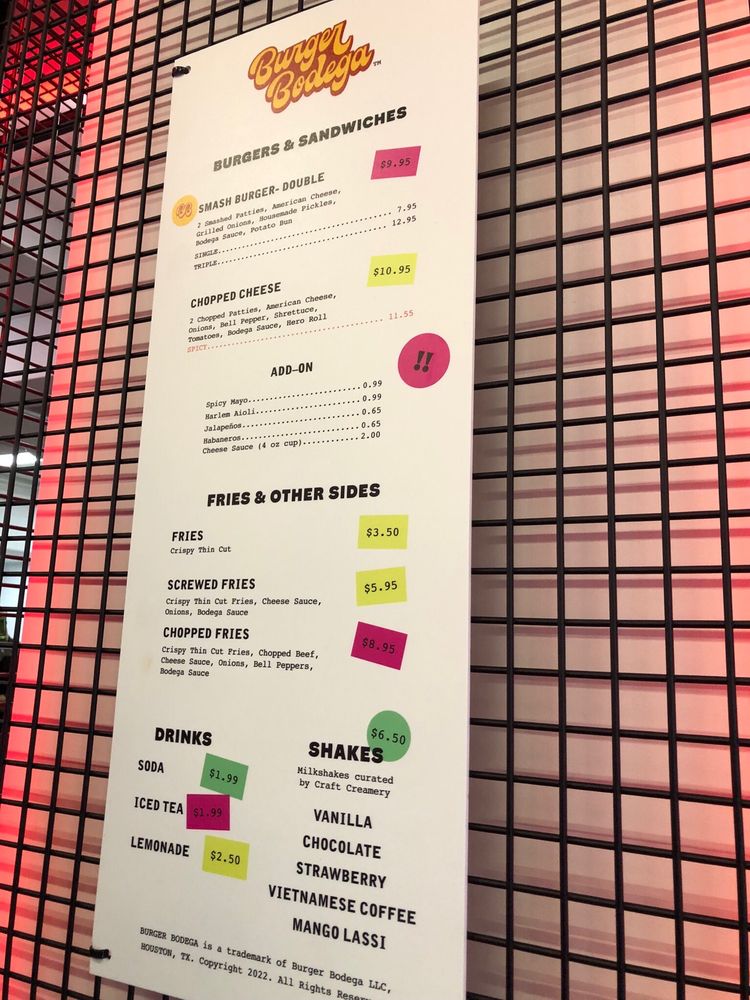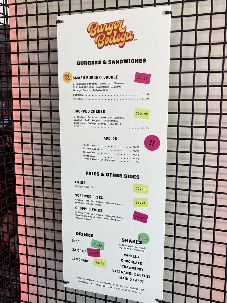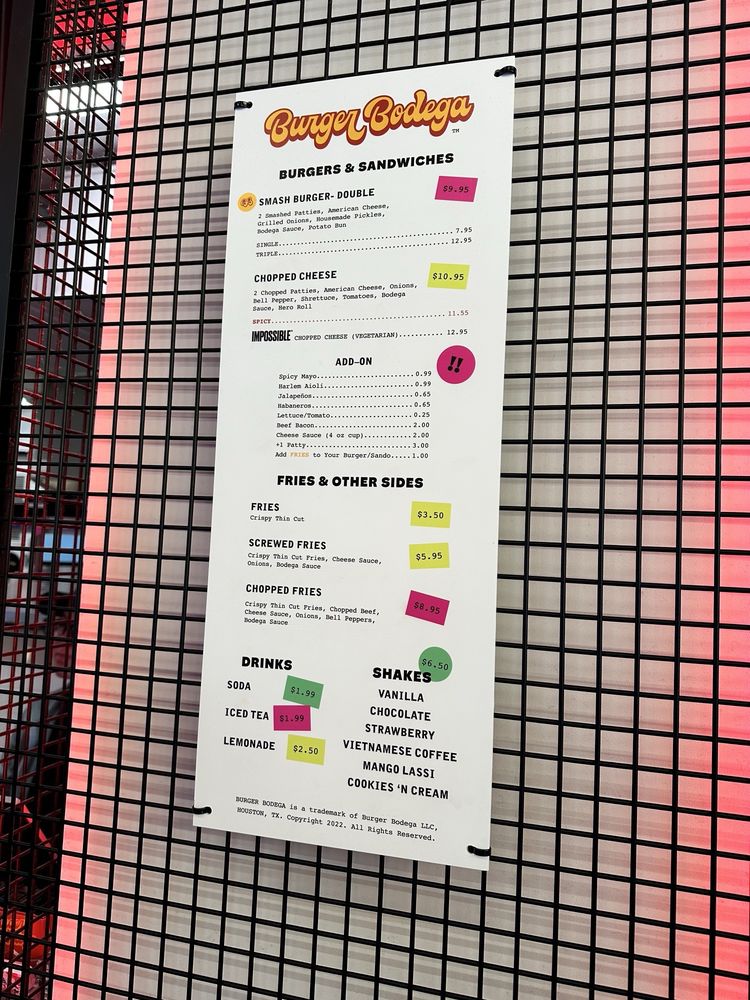 Burger Bodega, located in Houston, is a must-visit for burger enthusiasts. With a menu featuring smash burgers like the Single, Double, and Triple, as well as unique options like the Chopped Cheese, this spot offers a flavorful experience. The sides, including Fries and Potato Wedges with various topping options, complement the delicious burgers perfectly. The drink selection ranges from classic sodas to specialty teas and lemonades. Customers praise the impeccable service and vibrant atmosphere, making dining here a memorable experience. Burger Bodega stands out for its quality ingredients, reasonable prices, and overall great value. Whether you're a fan of classic burgers or looking to try something new, this restaurant is sure to satisfy your cravings.